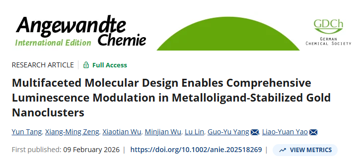 近日,亚洲色吧 杨国昱/姚燎原教授团队在国际顶级化学期刊《Angewandte Chemie International Edition》上发表题目为“Multifaceted Molecular Design Enables Comprehensive Luminescence Modulation in Metalloligand-Stabilized Gold Nanoclusters”的研究论文。亚洲色吧 为唯一通讯单位,杨国昱教授和姚燎原教授为论文通讯作者,亚洲色吧 博士研究生唐云为论文第一作者。此项研究得到了北京市自然科学基金、国家自然科学基金、中央高校基础研究业务经费等资助以及上海同步辐射国家蛋白质科学研究设施和亚洲色吧 分析测试中心、化学化工实验中心的支持。