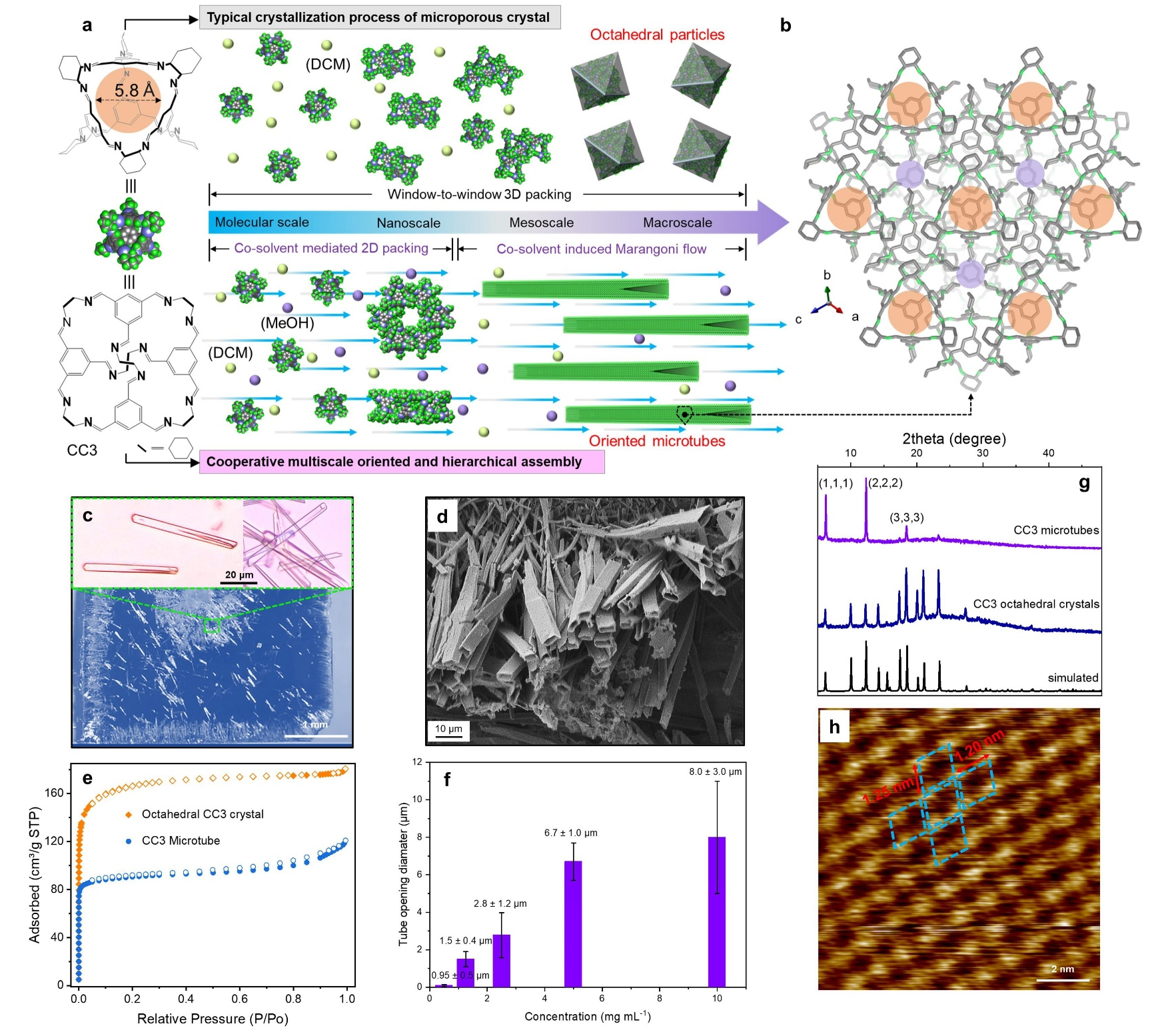 在前期研究的基础上,孙建科教授课题组以典型有机分子笼CC3为研究对象,提出了一种基于物理与化学作用的多尺度协同控制自组装策略。该策略结合分子尺度的分子堆积调控与介观尺度流场的定向传质,成功实现了孔道取向与定向多级次生长,一步构建出单晶级有机分子笼微管及其阵列结构。