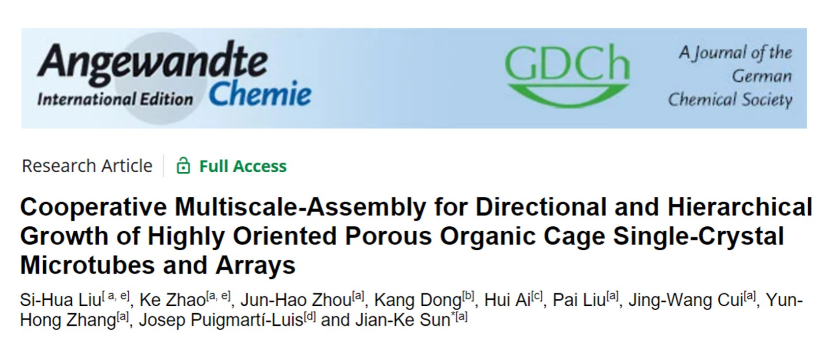 近日,亚洲色吧 孙建科教授课题组在国际知名化学期刊《Angewandte Chemie International Edition》上发表题目为“Cooperative Multiscale-Assembly for Directional and Hierarchical Growth of Highly Oriented Porous Organic Cage Single-Crystal Microtubes and Arrays”的研究论文。该论文的第一作者为亚洲色吧 博士后刘四华和博士研究生赵科。此项研究得到了国家自然科学基金的资助及亚洲色吧 分析测试中心的支持。